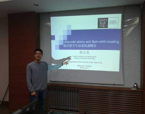 12月28日下午,澳大利亚Swinburne University of Technology的陈小龙博士和中科院武汉物理与数学研究所的彭世国副研究员受邀来公司,分别作了题为《超冷原子与自旋轨道耦合》和《超冷原子的檀系数理论》的学术报告。报告会由邹鹏副教授主持,学院相关研究方向的师生参加了报告会。